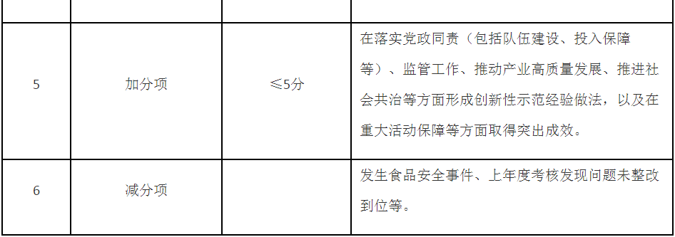 第五條 考核內(nèi)容主要包括食品安全基礎(chǔ)工作推進、年度重點工作落實、食品安全狀況等,同時設(shè)置即時性工作評價和加減分項(考核內(nèi)容要點見附件)。具體考核指標及分值在年度食品安全工作考核方案及其細則中明確,設(shè)置要科學(xué)合理,可操作、可評價、可區(qū)分,切實減輕基層負擔(dān)。