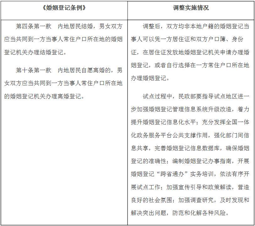 二、在試點(diǎn)地區(qū),相應(yīng)暫時(shí)調(diào)整實(shí)施《婚姻登記條例》第四條第一款、第十條第一款的有關(guān)規(guī)定(目錄附后)。調(diào)整后,雙方均非本地戶籍的婚姻登記當(dāng)事人可以憑一方居住證和雙方戶口簿、身份證,在居住證發(fā)放地婚姻登記機(jī)關(guān)申請(qǐng)辦理婚姻登記,或者自行選擇在一方常住戶口所在地辦理婚姻登記。