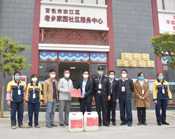 右江區(qū)總工會(huì)領(lǐng)導(dǎo)向老鄉(xiāng)家園-迎龍安置小鎮(zhèn)服務(wù)企業(yè)益眾物業(yè)公司捐贈(zèng)防疫物資