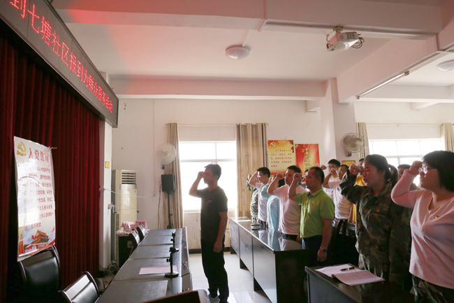 ????????之后,全體黨員重溫《入黨誓詞》?!拔抑驹讣尤胫袊伯a(chǎn)黨,擁護黨的綱領(lǐng),遵守黨的章程,履行黨員義務(wù),執(zhí)行黨的決定......”,清澈嘹亮的聲音貫穿整個會場,進一步強化了黨員的責(zé)任意識。