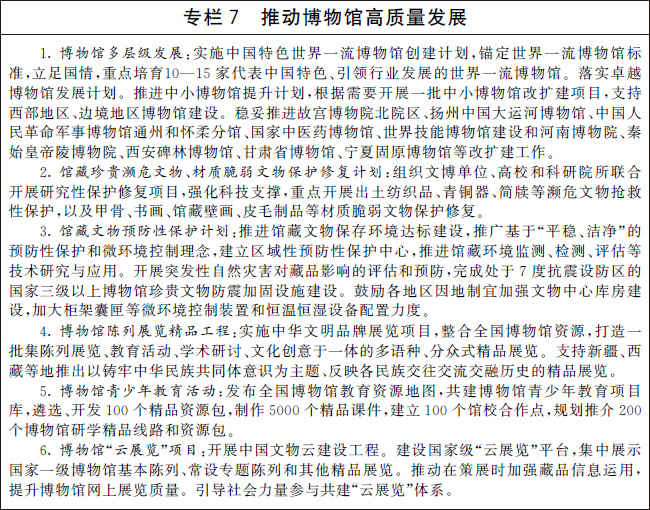 創(chuàng)新文物保護利用機制,加強文物和文化遺產保護利用,建設國家文物保護利用示范區(qū)。健全國有文物資源資產管理制度,推進文物資源資產管理信息共享,部署開展相關試點工作。完善各方主體參與文物保護利用的支持政策,保障利益相關方合法權益。探索創(chuàng)新對文物資源密集區(qū)的支持方式。建設文物領域國家智庫。
