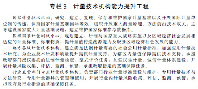 (二十一)加快計量技術(shù)機構(gòu)建設(shè)。深化計量技術(shù)機構(gòu)改革創(chuàng)新發(fā)展,優(yōu)化整合國家計量技術(shù)機構(gòu)、區(qū)域國家計量測試中心、地方各級計量技術(shù)機構(gòu)和行業(yè)主管部門專業(yè)計量技術(shù)機構(gòu)。大力推動國家計量技術(shù)機構(gòu)創(chuàng)新發(fā)展,通過組織開展重大測量原理、方法前沿技術(shù)攻關(guān),建立量子計量基準并保持國際等效,提供一流的量值溯源和測量服務(wù),支撐國家科技創(chuàng)新、工業(yè)競爭力提升和經(jīng)濟社會發(fā)展。充分發(fā)揮省級人民政府和行業(yè)主管部門計量基礎(chǔ)設(shè)施規(guī)劃建設(shè)自主權(quán),加強普惠性、基礎(chǔ)性和公益性計量基礎(chǔ)設(shè)施建設(shè)。提升計量技術(shù)機構(gòu)服務(wù)市場的能力和水平,推動形成一批專業(yè)領(lǐng)域服務(wù)平臺,培育一批專業(yè)化、社會化、網(wǎng)絡(luò)化的服務(wù)機構(gòu),為經(jīng)濟社會發(fā)展和行業(yè)創(chuàng)新提供計量測試服務(wù)。