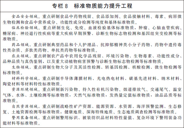 (二十)加大標準物質(zhì)研制應(yīng)用。建立完善以國家基準物質(zhì)、國家標準物質(zhì)和工作標準物質(zhì)為主要組成部分的標準物質(zhì)體系。實施標準物質(zhì)能力提升工程,加快生命科學(xué)、生物醫(yī)藥、環(huán)境監(jiān)測、食品安全、自然資源、刑事司法等重點領(lǐng)域的標準物質(zhì)研制和應(yīng)用。加強標準物質(zhì)監(jiān)管能力建設(shè)和關(guān)鍵共性技術(shù)研究,提升標準物質(zhì)不確定度水平。探索建立標準物質(zhì)質(zhì)量追溯制度,建設(shè)一批標準物質(zhì)量值核查驗證實驗室,建立標準物質(zhì)質(zhì)量追溯平臺,形成研發(fā)、生產(chǎn)、應(yīng)用全壽命周期的監(jiān)管能力。