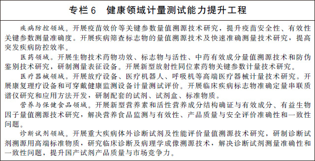 (十五)服務(wù)大眾健康與安全。加快醫(yī)療健康領(lǐng)域計量服務(wù)體系建設(shè),圍繞疾病防控、生物醫(yī)藥、診斷試劑、高端醫(yī)療器械、康復(fù)理療設(shè)備、可穿戴設(shè)備、營養(yǎng)與保健食品等開展關(guān)鍵計量測試技術(shù)研究和應(yīng)用。加強體育設(shè)施和器材計量技術(shù)研究和測試服務(wù),促進體育產(chǎn)業(yè)高質(zhì)量發(fā)展。完善地質(zhì)和海洋災(zāi)害、地震、洪澇干旱、森林草原火災(zāi)等自然災(zāi)害防御的計量保障體系,提高防災(zāi)、減災(zāi)、救災(zāi)計量能力。加強危險化學(xué)品、礦山、建筑施工、地質(zhì)勘查等安全生產(chǎn)相關(guān)計量器具的研制生產(chǎn)和監(jiān)督管理。加強公共安全領(lǐng)域計量服務(wù)體系建設(shè),開展交通安全、社會穩(wěn)定和安全等領(lǐng)域關(guān)鍵計量測試技術(shù)研究和應(yīng)用,推進交通監(jiān)管設(shè)備、警用裝備、刑事技術(shù)產(chǎn)品等計量測試基礎(chǔ)設(shè)施建設(shè)。